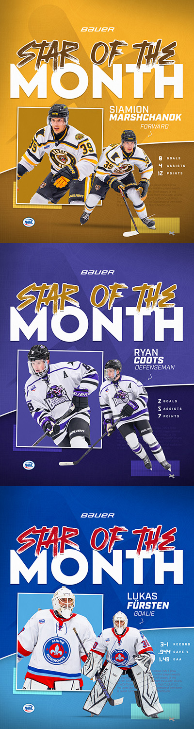 The North American Hockey League (NAHL) has announced its Bauer Hockey player awards for September. The Forward of the Month is Siamion Marshchanok from the Austin Bruins. The Defenseman of the Month is Ryan Coots from the Lone Star Brahmas. The Goaltender of the Month is Lukas Fürsten from the Maine Nordiques.