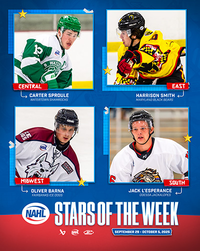 The North American Hockey League (NAHL) announced today the Bauer Hockey Divisional Stars of the Week for the week ending October 5, 2025. Only players that are nominated by their respective teams are considered for the Divisional Player of the Week awards.