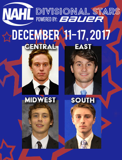 The North American Hockey League (NAHL) today announced the Divisional Stars of the Week presented by Bauer Hockey for the week ending December 17, 2017. The Bauer Hockey Divisional Stars of the Week is a weekly feature during the 2017-18 regular season that honors the top performing players in each of the four NAHL divisions. Only players that are nominated by their respective teams are considered for the Divisional Players of the Week award.