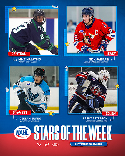 The North American Hockey League (NAHL) announced today the Bauer Hockey Divisional Stars of the Week for the week ending September 21, 2025. Only players that are nominated by their respective teams are considered for the Divisional Player of the Week awards.