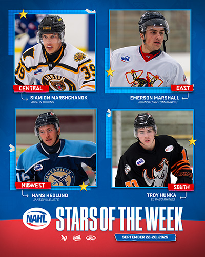The North American Hockey League (NAHL) announced today the Bauer Hockey Divisional Stars of the Week for the week ending September 28, 2025. Only players that are nominated by their respective teams are considered for the Divisional Player of the Week awards.