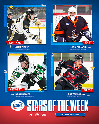 The North American Hockey League (NAHL) announced today the Bauer Hockey Divisional Stars of the Week for the week ending October 12, 2025. Only players that are nominated by their respective teams are considered for the Divisional Player of the Week awards.
