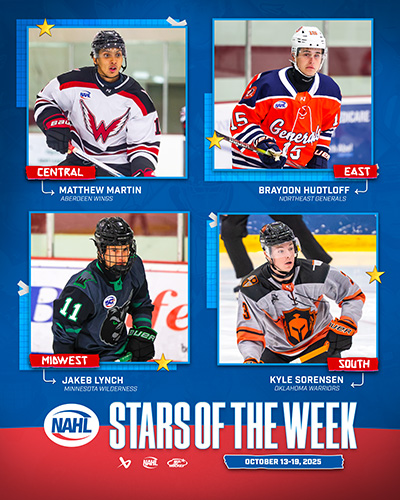 The North American Hockey League (NAHL) announced today the Bauer Hockey Divisional Stars of the Week for the week ending October 19, 2025. Only players that are nominated by their respective teams are considered for the Divisional Player of the Week awards.