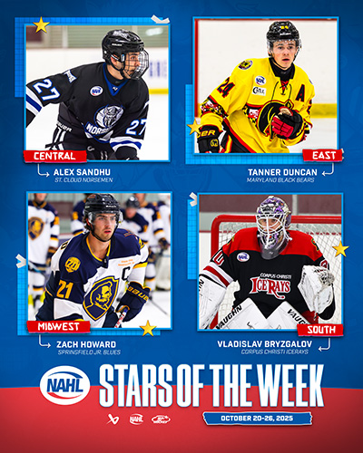 The North American Hockey League (NAHL) announced today the Bauer Hockey Divisional Stars of the Week for the week ending October 26, 2025. Only players that are nominated by their respective teams are considered for the Divisional Player of the Week awards.