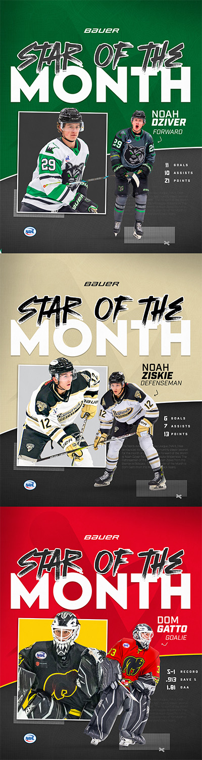 The North American Hockey League (NAHL) has announced its Bauer Hockey player awards for October. The Forward of the Month is Noah Dziver from the Minnesota Wilderness. The Defenseman of the Month is Noah Ziskie from the Bismarck Bobcats. The Goaltender of the Month is Dom Gatto from the Maryland Black Bears.