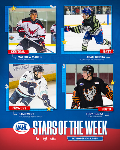 The North American Hockey League (NAHL) announced today the Bauer Hockey Divisional Stars of the Week for the week ending November 23, 2025. Only players that are nominated by their respective teams are considered for the Divisional Player of the Week awards.