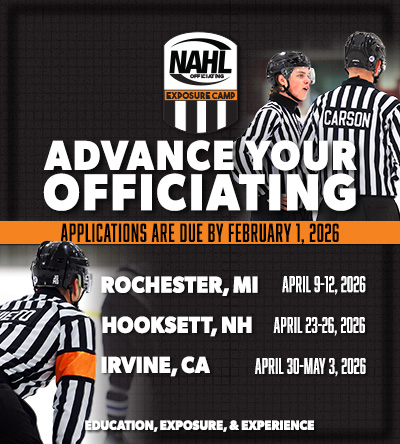 The NAHL Officitiating Exposure Camps are now open for 2026. These Exposure Camps are designed to provide participants with the opportunity to develop as officials. The camps will feature classroom sessions, off-ice testing, on-ice testing, and the opportunity to gain experience working with both the Three-Official and Four-Official systems.