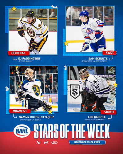 The North American Hockey League (NAHL) announced today the Bauer Hockey Divisional Stars of the Week for the week ending December 21, 2025. Only players that are nominated by their respective teams are considered for the Divisional Player of the Week awards.
