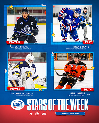 The North American Hockey League (NAHL) announced today the Bauer Hockey Divisional Stars of the Week for the week ending January 18, 2026. Only players that are nominated by their respective teams are considered for the Divisional Player of the Week awards.