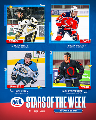 The North American Hockey League (NAHL) announced today the Bauer Hockey Divisional Stars of the Week for the week ending January 25, 2026. Only players that are nominated by their respective teams are considered for the Divisional Player of the Week awards.